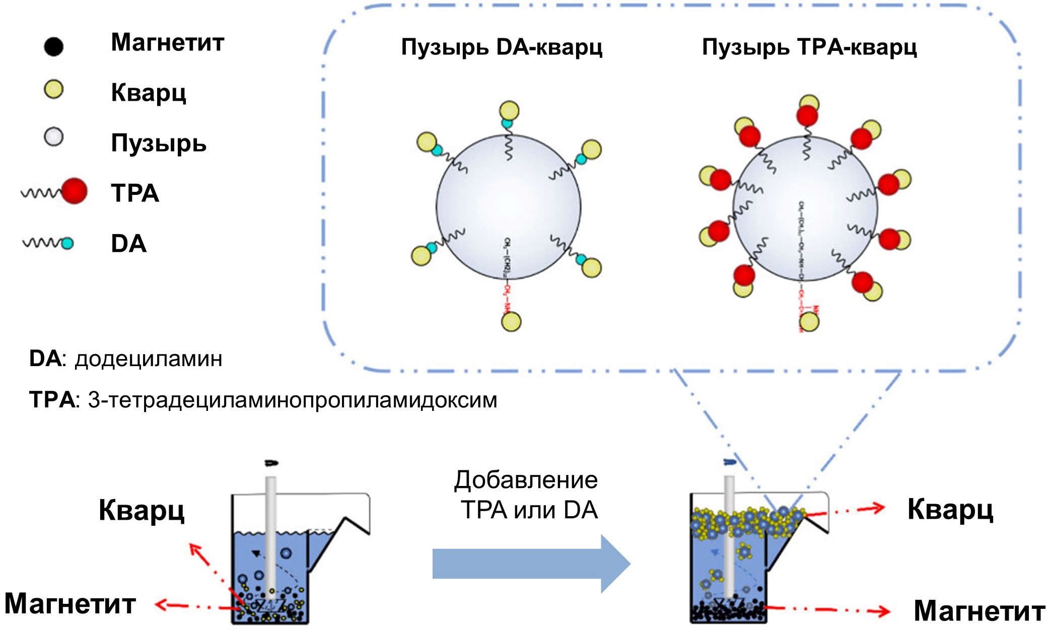 Анализ с помощью инфракрасной Фурье-спектроскопии показал, что ТПА может адсорбироваться на поверхности кварца, но не на поверхности магнетита. Более того, с помощью ζ-потенциала и квантово-химических расчётов было установлено, что ТПА образует водородные связи с атомами кислорода на поверхности кварцевого минерала. Следовательно, ТПА может быть использован в качестве эффективного собирателя в обратной флотации магнетита.
