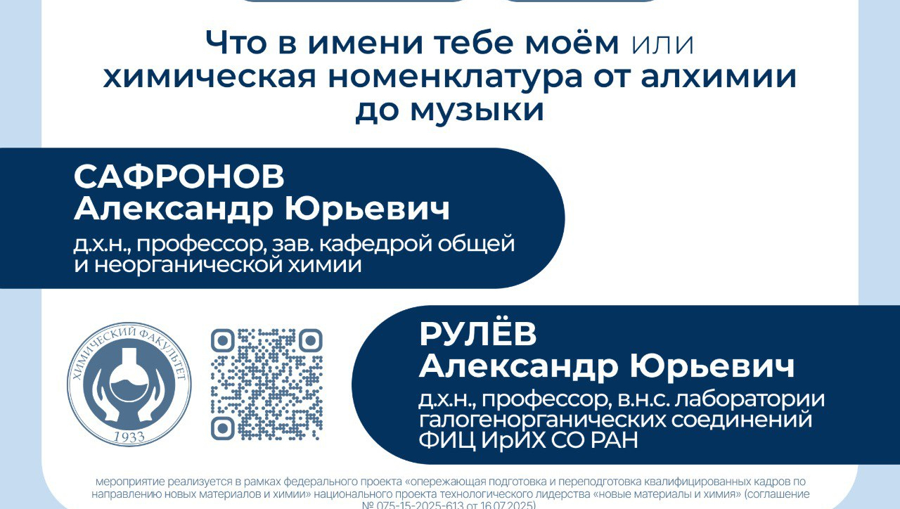 Химический факультет ИГУ приглашает всех желающих на открытую лекцию «Что в имени тебе моём, или химическая номенклатура от алхимии до музыки»! Лекторы: Александр Сафронов, доктор химических наук, профессор, заведующий кафедрой общей и неорганической химии, Александр Рулёв, доктор химических наук, профессор, ведущий научный сотрудник лаборатории галогенорганических соединений ФИЦ ИрИХ СО РАН.