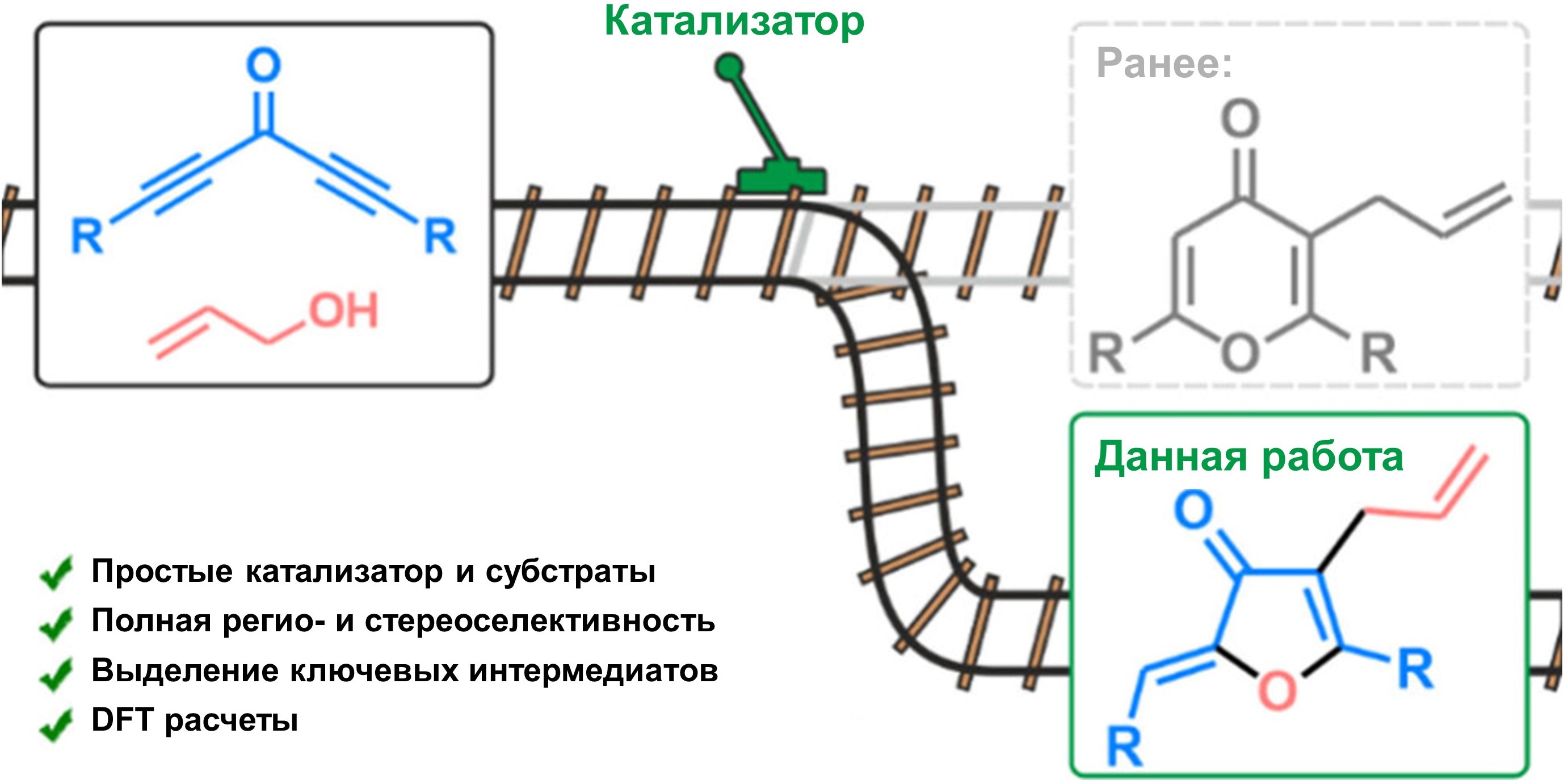Сотрудниками лаборатории непредельных гетероатомных соединений описан новый, катализируемый основаниями синтез ранее неизвестных 4-аллил-2-метилен-3(2H)-фуранонов из симметричных диинонов и аллильных спиртов посредством реакции нуклеофильного присоединения/перегруппировки Кляйзена/циклизации. Раскрыта возможность переключения пути реакции на стадии циклизации от 3-аллил-4-пиронов к изомерным 4-аллил-3(2H)-фуранонам за счет замены катализатора.