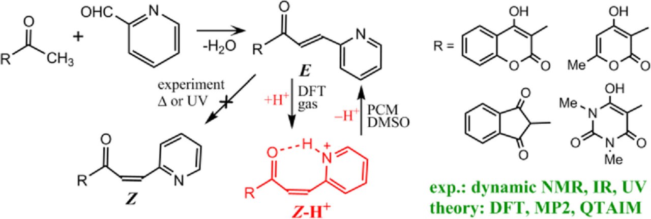 Оказалось, что его появление кардинально меняет поведение новых молекул: в отличие от пирролсодержащих аналогов, они перестают реагировать на свет - исчезает способность к E/Z-изомеризации (кроме того, ее невозможно вызвать и термически). Расчеты и эксперименты выявили причину: E-изомер гораздо стабильнее за счет сильной внутримолекулярной водородной связи O–H···O. В пиррольных аналогах ключевую роль играли кислые N–H протоны, образующие N–H···O-связи в Z-форме, что делало её доступной. В пиридине таких протонов нет.