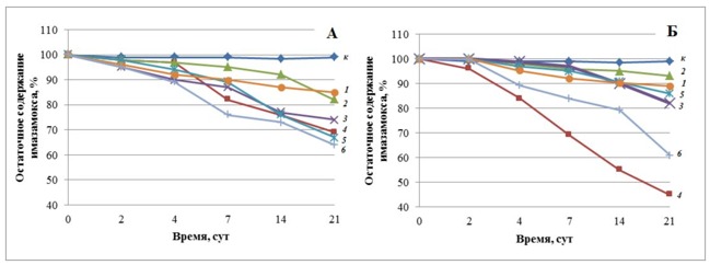 Таким образом, в ходе работы из 29 исследованных штаммов, было отобрано шесть штаммов микромицетов и три штамма бактерий, способных к деструкции как фоновых доз пестицида имазамокс, так и превышающих их значения. За три недели эксперимента максимальная убыль имазамокса под действием микроорганизмов составила 54–55%.