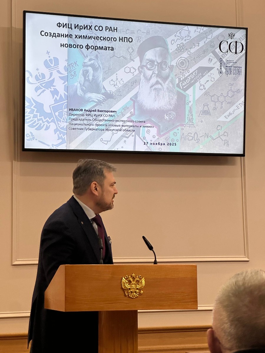 27 ноября состоялось заседание Совета по вопросам развития Сибири при Председателе Совета Федерации Федерального Собрания Российской Федерации на тему "Сибирская экономика – от сырьевой к высокотехнологичной". Директор ФИЦ ИрИХ СО РАН Андрей Иванов рассказал сенаторам и гостям об опыте формирования на базе ФИЦ Научно-производственного объединения нового типа в области химических технологий и биотеха и рассказал о проблемах и юридических барьерах, с которыми приходится сталкиваться в ходе создания и функционирования НПО, основной задачей которого является обеспечение независимости РФ по ряду востребованных продуктов малотоннажной химии.